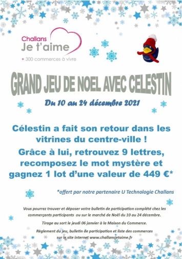 Grâce à Célestin, retrouvez des lettres exposées dans plusieurs vitrines de commerçants participants, recomposez le mot mystére et gagnez 1 lot d'une valeur de 449 € offert par notre partenaire U TECHNOLOGIE Challans.