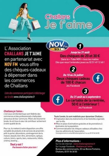 L'association CHALLANS JE T'AIME en partenariat avec NOV FM vous offre tout l'été des chèques-cadeaux à dépenser dans les commerces de Challans :