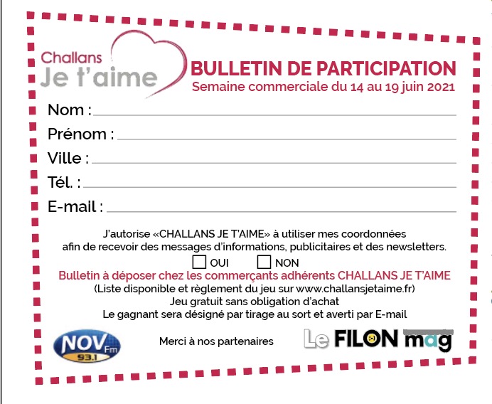 Découpez le bulletin de participation dans le magazine LE FILON MAG de juin et déposez-le chez les commerçants adhérents CHALLANS JE T'AIME. Le tirage au sort aura lieu jeudi 24 juin à la Maison du commerce (les heureux gagnants seront avertis par mail).