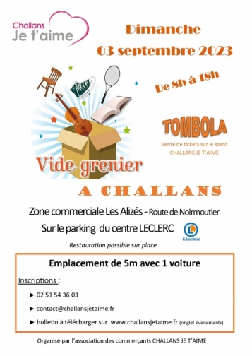 Le dimanche 03 septembre, grand vide-grenier sur le parking du centre LECLERC, zone commerciale LES ALIZES, route de Noirmoutier à Challans de 8h à 18h.
